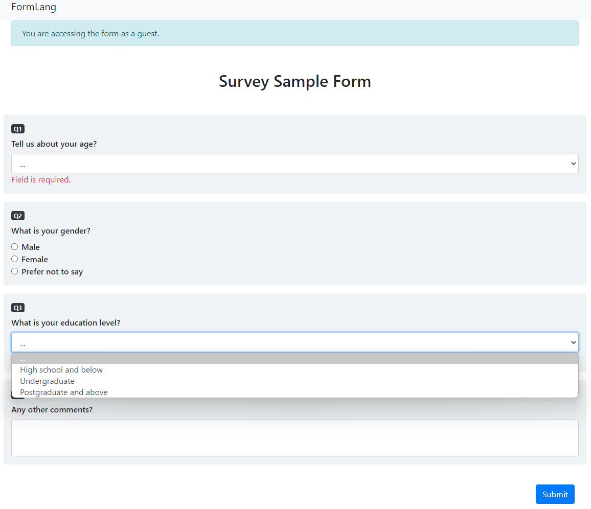 - Choose any of the standard question types, including multiple choice questions, open-ended questions, yes/no questions; Or use a single table question to collect a list of records for one respondent.